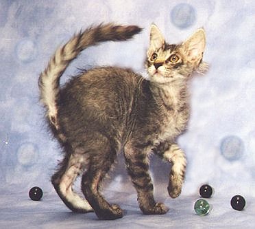 Dieser kleine LaPerm Kater heißt "Smeralda's Inner Smile" und hat einen Maine Coon zum Vater, denn bei dieser jungen Rasse muss noch viel Outcross betrieben werden, um den Genpool zu erweitern. Trotzdem muss der Typ der LaPerm erhalten bleiben. Eine schwierige Aufgabe für die Züchter |