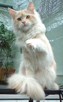 Amerika´s einheimische Katzenrasse Nummer 1 ist die Maine Coon. Ihr Ursprung ist ungewiß - wie bei allen sogenannten "natürlichen" Katzenrassen und es existieren mehrere Geschichten über ihre Herkunft. Eine davon macht sie zum Kreuzungsprodukt zwischen einer kurzhaarigen Hauskatze und einem Waschbären ....selbstverständlich genetisch völlig unmöglich! |
